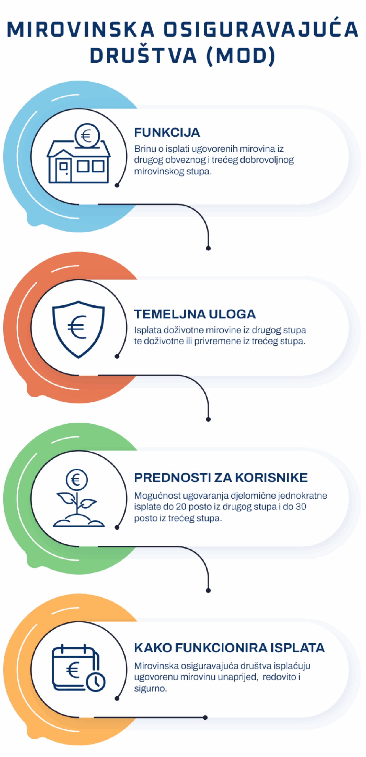 Međutim, ako se odabere kombinirana mirovina (isplata iz prvog i drugog stupa) sva ušteđevina iz obveznog mirovinskog fonda prebacuje se u mirovinsko osiguravajuće društvo (MOD) koje korisnik odabere. U tom slučaju korisnik prima mirovinu iz dva izvora: HZMO isplaćuje mirovinu iz prvog stupa, a MOD preuzima ulogu isplatitelja mirovine iz drugog stupa, na temelju sredstava koja su godinama ušteđena u obveznom mirovinskom fondu. U Hrvatskoj trenutačno posluju dva mirovinska osiguravajuća društva koja nisu povezana s obveznim mirovinskim fondovima: Hrvatsko mirovinsko osiguravajuće društvo (HRMOD) i Raiffeisen mirovinsko osiguravajuće društvo (RMOD).
